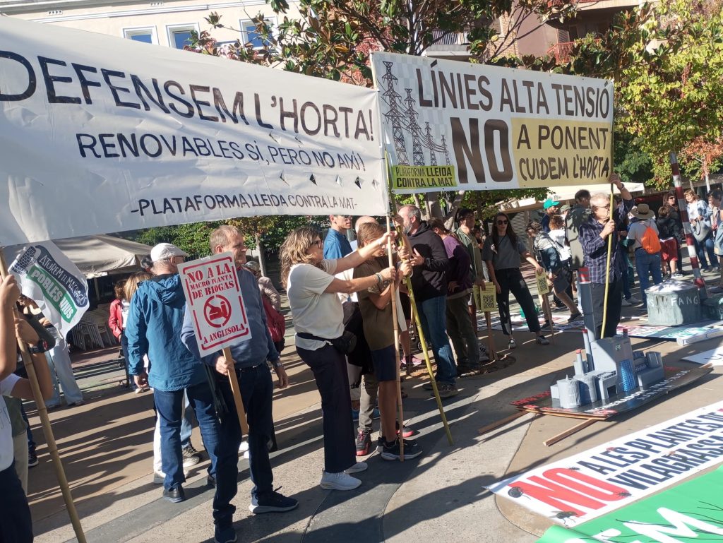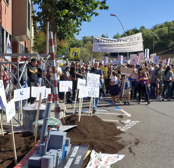 Durant el recorregut es va fer una primera parada al Departament d’Agricultura on es van abocar saques d’adob orgànic i s’hi van plantar pancartes amb els noms de les principals empreses promotores dels projectes i també unes maquetes de dues centrals de biogàs i dues torres elèctriques.